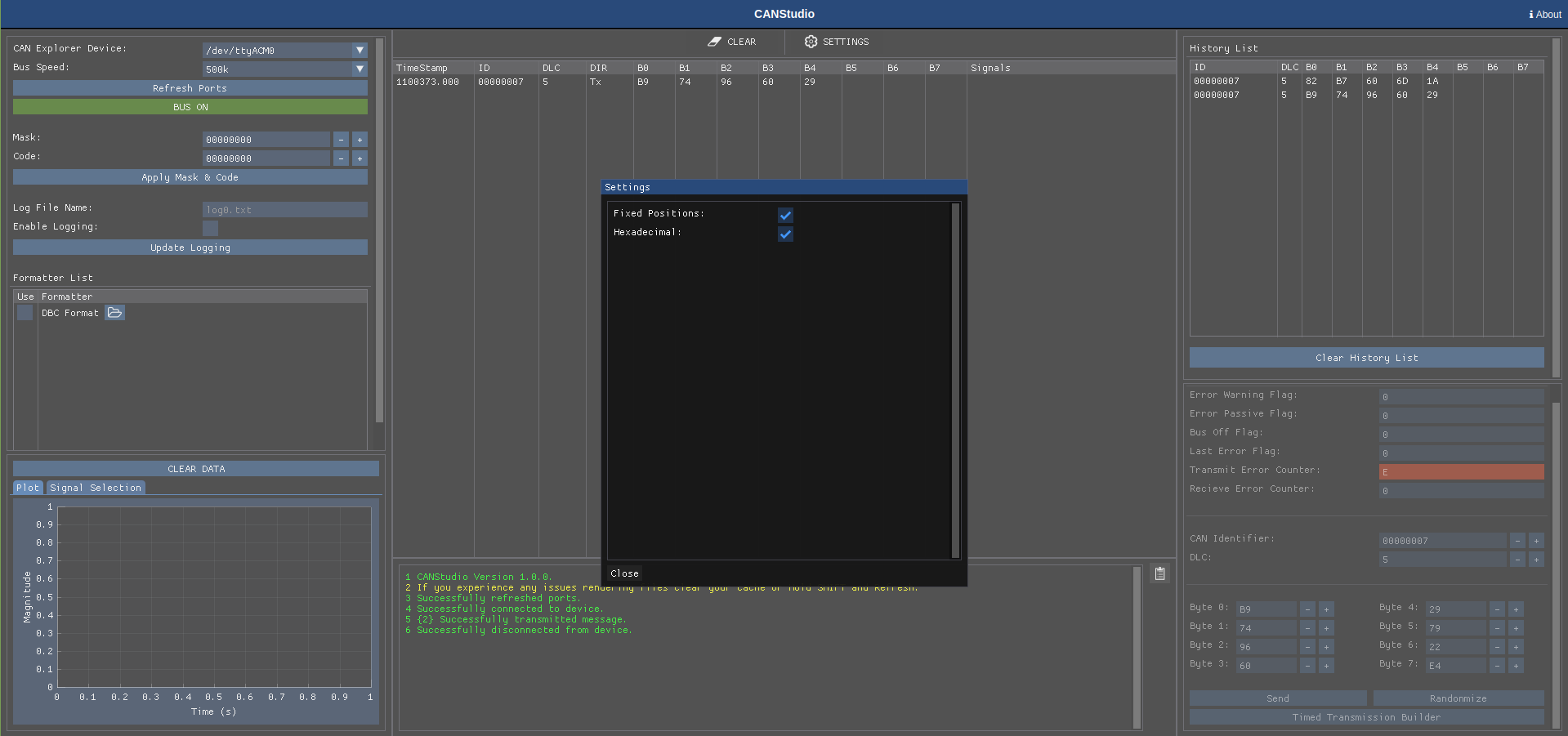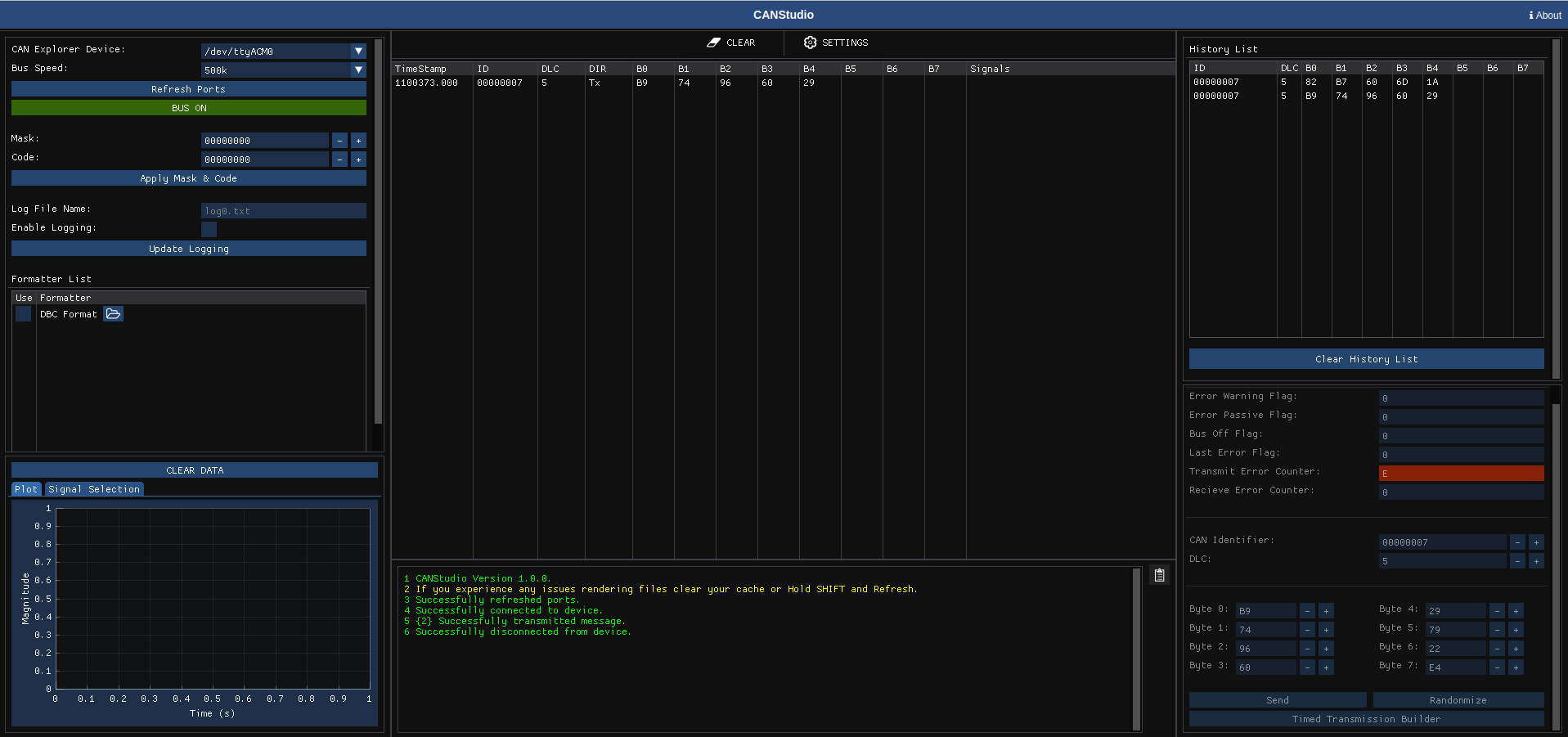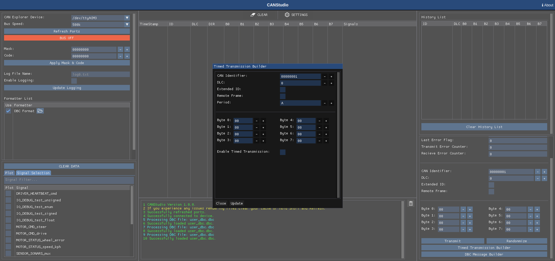 Using formatter’s can bus messages can either be tagged, decoded, or arranged in a specific way to make them easier to understand. Right now, CANStudio supports plain text (always on by default) and DBC parsing / message generation.